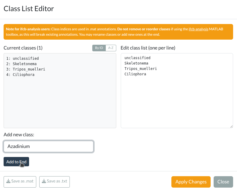 If you change the order or remove classes, existing .mat annotations become invalid for ifcb-analysis!